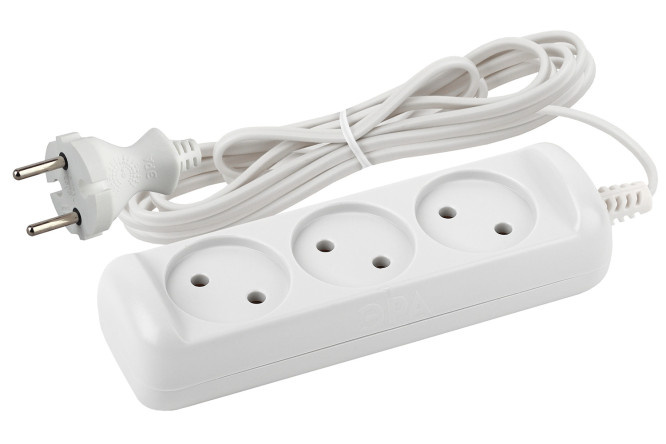 Household extension cord ERA UX-3-3m for 3 sockets, without grounding, with an extended SHVVP wire of 3 meters. Designed for connecting simple household appliances of standard power. Maximum load – 6 A / 1300 W. Basic white color, neat design with rounded corners. For comfort and safety, the sockets are slightly “recessed” into the body. Made from reliable polypropylene with special flame retardants that prevent combustion.