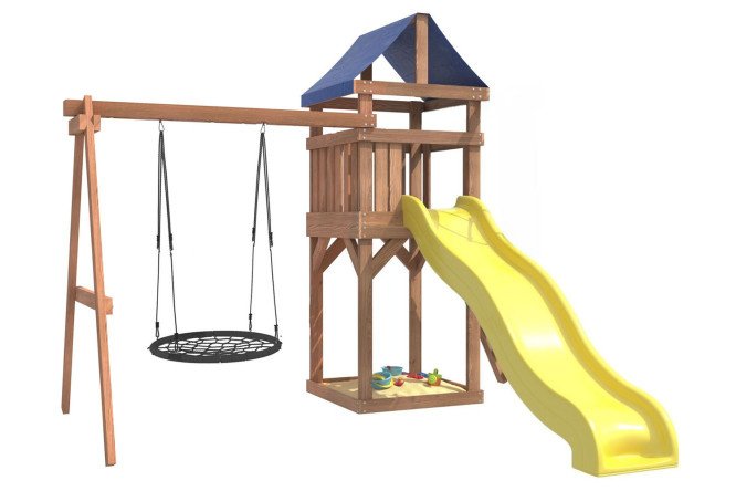 The IgroWoods playground is an excellent solution for children’s active recreation in the fresh air. It is a multifunctional gaming complex, which is made of high-quality and safe materials, which ensures the durability and reliability of the structure. The multifunctional sports play complex is designed for children from 3 to 14 years old. With the help of this playground, children will be able to develop their physical fitness, coordination and logical thinking. In addition, playing outdoors helps strengthen the immune system and improve the overall health of children. Outdoor hanging garden swings are suitable for children and adults, as the swing beam can withstand a total weight of up to 250 kg. The platform is made from deciduous and coniferous timber. The material has a natural wood texture, treated with special compounds for longer use and protection from wood destruction. All elements are pre-polished, the edges of the products are rounded. A minimum of metal elements reduces the risk of injury. The site is placed on the ground (concreting is not necessary).