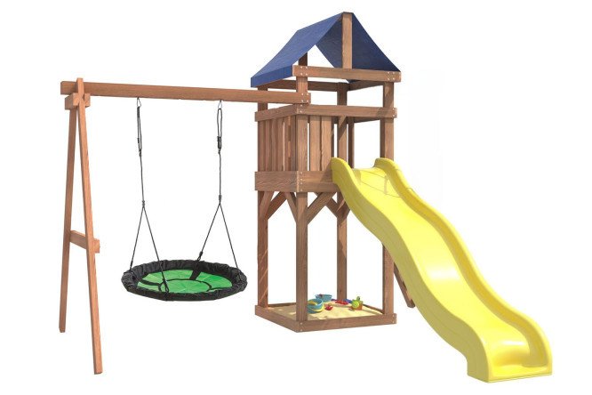 The IgroWoods playground is an excellent solution for children’s active recreation in the fresh air. It is a multifunctional gaming complex, which is made of high-quality and safe materials, which ensures the durability and reliability of the structure. The multifunctional sports play complex is designed for children from 3 to 14 years old. With the help of this playground, children will be able to develop their physical fitness, coordination and logical thinking. In addition, playing outdoors helps strengthen the immune system and improve the overall health of children. Outdoor hanging garden swings are suitable for children and adults, as the swing beam can withstand a total weight of up to 250 kg. The platform is made from deciduous and coniferous timber. The material has a natural wood texture, treated with special compounds for longer use and protection from wood destruction. All elements are pre-polished, the edges of the products are rounded. A minimum of metal elements reduces the risk of injury. The site is placed on the ground (concreting is not necessary).