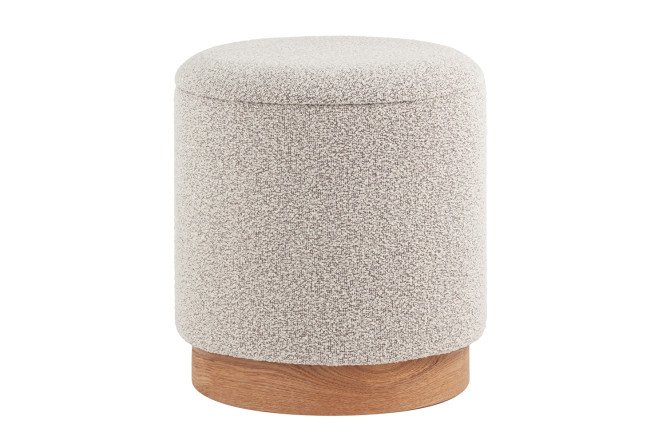 A laconic pouf in a modern style is an excellent functional addition to the hallway, dressing table, nursery or bedroom. The bouclé upholstery is a very soft and pleasant-to-touch material that blends harmoniously with the light solid wood base. The pouf is equipped with a spacious drawer for storing various small items.