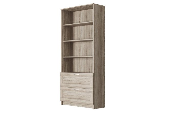 The tall straight shelving unit Sirius is a universal piece of furniture that is suitable for furnishing any room. An ideal solution for those who prefer a laconic design and order in everything. The convenient storage system is represented by two drawers, complemented by stylish profile handles, as well as four open niches on which you can place books, boxes and decorative items. The presence of a back wall will prevent things from falling behind the module. The shelves are made of durable chipboard and can withstand up to 12 kilograms of load.