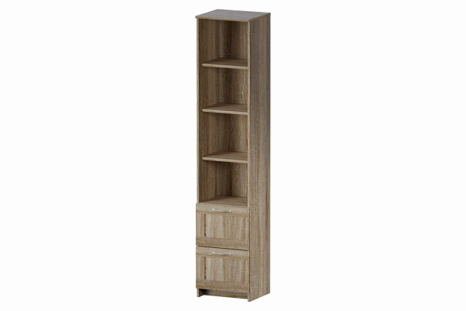 The tall straight shelving unit Sirius is a universal piece of furniture that is suitable for furnishing any room. An ideal solution for those who prefer a laconic design and order in everything. The convenient storage system is represented by two drawers, complemented by stylish profile handles, as well as four open niches on which you can place books, boxes and decorative items. The presence of a back wall will prevent things from falling behind the module. The shelves are made of durable chipboard and can withstand up to 12 kilograms of load.