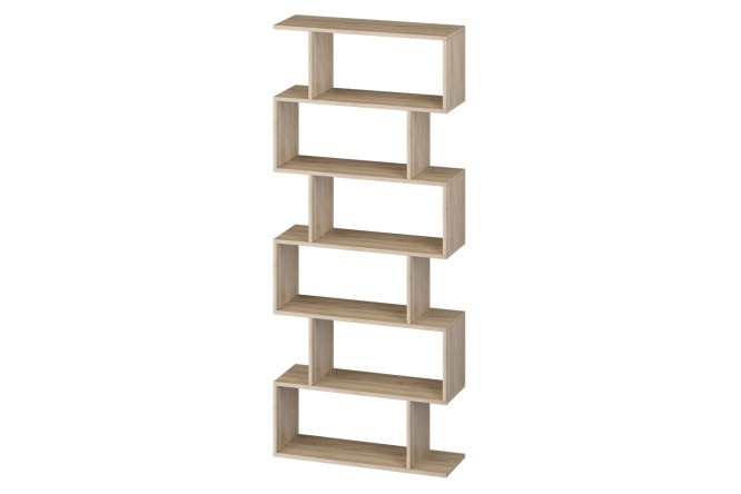 The Nice bookcase with a laconic design is suitable for a living room, dining room, office, nursery or office in a modern style. It consists of six open shelves of the same size, located one above the other in a checkerboard pattern with a slight offset to the side. Can be used to display collectible figurines, holiday tableware and home decoration.