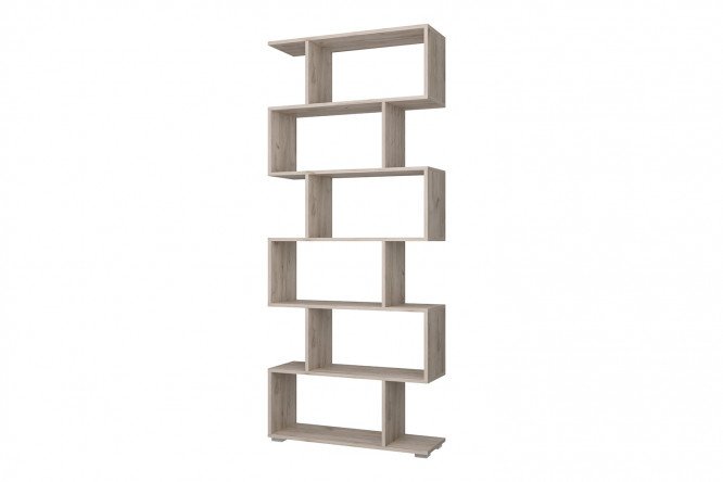 Slim shelving unit made of laminated chipboard in kraft gray color.