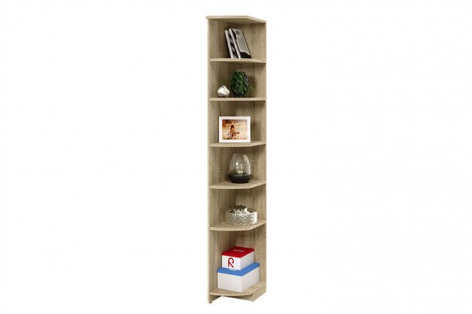 The rack will help make the interior more expressive and functional. It can be used independently, installed in a free corner, or together with a cabinet from the collection of the same name. The shelving unit takes up little space, but instead of a flat end wall of the cabinet, you get several open, radial-shaped shelves. You can place many different little things, decorative elements, and photographs on them. The rack is made of laminated chipboard, a lightweight and durable material; the shelves can withstand significant loads.