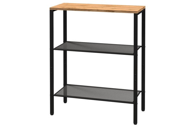 The Toronto bookcase is made of plain metal, and the top shelf, decorated with a wood-like finish with a pronounced texture, gives it an original look and expands the possibilities of using the product in interiors of different styles.