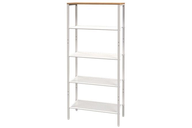 The Toronto bookcase is made of plain metal, and the top shelf, decorated with a wood-like finish with a pronounced texture, gives it an original look and expands the possibilities of using the product in interiors of different styles.