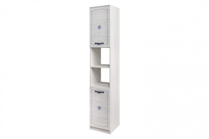 The Regatta shelving cabinet will help you rationally organize storage in the children’s room: near the desk or in the recreation area. Toys, clothes, books, materials for your favorite hobby – everything has its place on open and closed shelves. Swing doors are installed on hinges with closers for smooth and silent closing. The entire collection of furniture is designed in a marine style, which is manifested in the selected white and blue color scheme and images of ship ropes and a steering wheel painted on the facades.