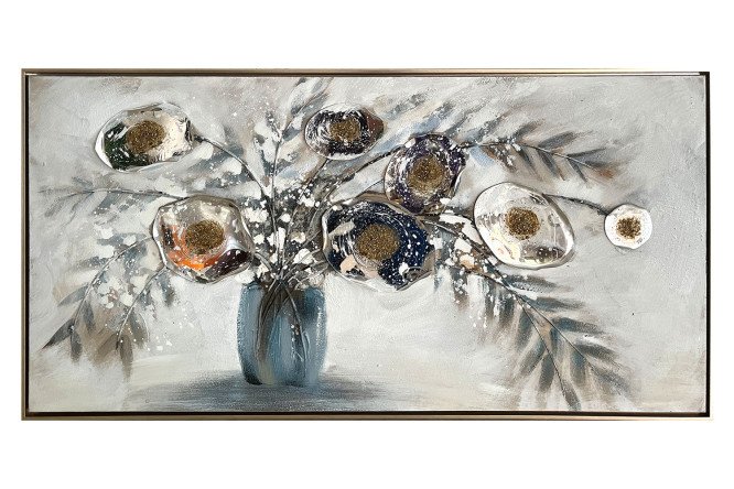 Every interior needs a spectacular accent – the reproduction of Flowers in a Vase can easily cope with this role. Still life is characterized by subtle colors, detailed hand-crafted work and a soft, cozy atmosphere. The relief and volume of the painting is given by an unusual execution technique: traditional painting on canvas is complemented by stems made of aluminum and stylized cups of flowers. The silver plastic baguette is reinforced on the back side with wooden planks and corners.