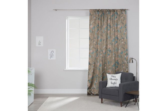 A closed Teodora curtain will create comfortable darkness in the bedroom or living room, and when moved to the side, it will provide maximum access to sunlight into the room. Using a curtain tape with three cords, the fabric can be gathered into classic pencil or radial folds. The fabric is decorated with an exquisite print: stylized tree branches with birds sitting on them are depicted on a coffee background. Dense polyester material with jacquard weaving does not wrinkle and does not shrink after washing.