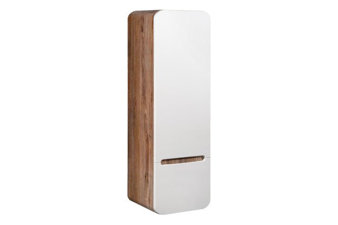 Bathroom cabinet RUNO NICE is a combination of impeccable style and modern trends in bathroom design. A pencil case with streamlined shapes will be a great addition to the interior; the body with a dark wood texture blends optimally with white facades. Smooth lines combined with a textured finish will make the bathroom feel warm and cozy. The cabinet is equipped with one right-hand hinged door and a drawer with silent, full-extension ball guides, and canopies for wall mounting. There are two internal shelves inside the cabinet. The function of the handle is performed by a decorative cutout. The fronts of the cabinet-case are made of MDF.