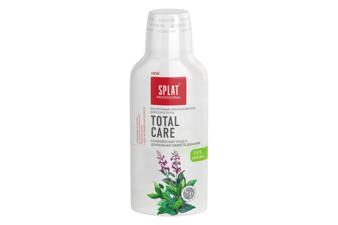 SPLAT Professional TOTAL CARE mouthwash with mint-spicy flavor gives long-lasting freshness to your breath. The unique patented complex BIO Sp.White® Mouthwash from the bromelain enzyme and bifidobacteria lysates brightens the enamel and normalizes the microbiota in the oral cavity. The LUCTATOL® complex reduces the risk of caries and prevents plaque by 96%. Essential oils of clove and fennel have an antibacterial, anti-inflammatory effect and take care of gums. Zinc gluconate prevents the growth of bacteria that cause bad breath. Magnolia bark extract has an anti-caries effect. Clinically proven effectiveness after 4 weeks of use.