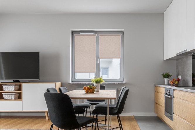The Tahiti roller blind is made of fabric (polyester). Protects against penetration of bright sunlight. Protects screens and monitors from sun glare. Control is carried out using a chain mechanism. Roller blinds can be easily installed on a plastic or wooden window, in an opening, niche, on a wall or ceiling. The curtain can be installed on an opening window sash without drilling. Brackets for installation on opening window sashes are included in the kit and can be adjusted to suit the thickness of the sash. The roller blind is equipped with a side fixation to protect the curtain from sagging on the opening flap.