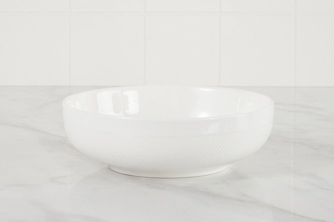 The salad bowl, made in a restrained English design and decorated with an elegant embossed mesh, will surely appeal to connoisseurs of classic white tableware. Any dish in it will appear in the most favorable light. The model is made of thin and at the same time very strong porcelain with an even, dense structure. The material contains the mineral mullite, which provides not only unsurpassed shine and amazing strength, but also high heat resistance of the product. The salad bowl can be used in the microwave oven and washed in the dishwasher.