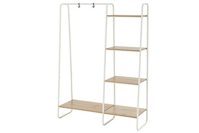 The Scandinavia wardrobe system is an excellent choice for organizing the storage of clothes and other things. The compact model will easily fit in a small space: in the hallway, bedroom, attic, children’s room, on the balcony. The module consists of a floor hanger for hangers and a shelving part with shelves. Since the shelves are open, it will not be difficult to find the desired item on them and maintain order. The set includes two hooks for hanging accessories or pots with indoor plants. To protect the floor covering from scratches, thrust bearings are provided – they need to be glued to the bottom of the frame.