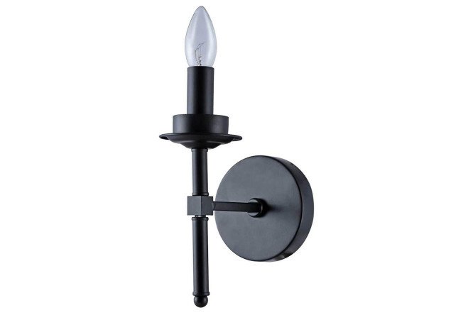The sconce is made of black coated metal and appears to have been forged by a skilled blacksmith. You can change the design of the product depending on the lamp used. A candle-shaped lamp remains visible and if you need soft, comfortable lighting, it is better to choose a light source with a frosted bulb. And when using a decorative retro lamp, the lamp will look most impressive.
