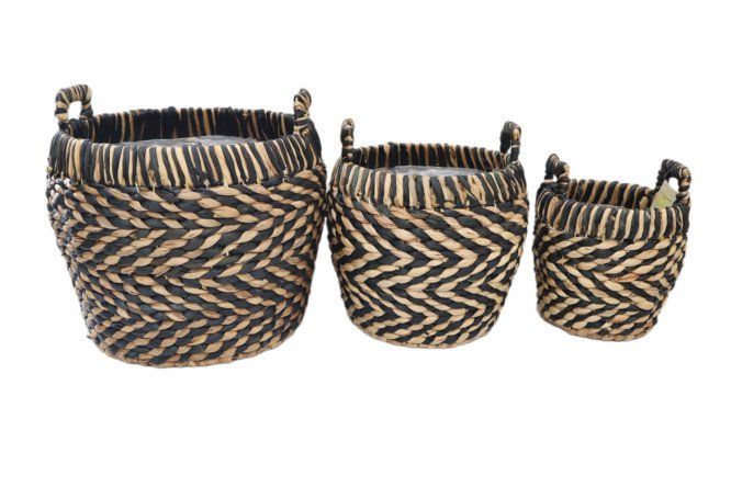 The set of GREEN ART ASPARAGUS flowerpots consists of three flowerpots woven from natural water hyacinth. Each pot has a plastic container inside.