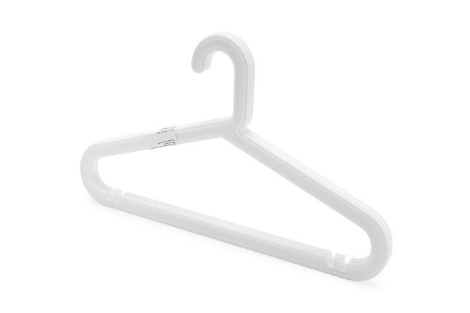 A set of hangers made from lightweight but durable plastic will help you organize your closet. The products can withstand the weight of even heavy clothing, retain the shape of delicate fabric items, and their smooth surface is safe for knitted items. The crossbar is convenient for hanging trousers and skirts; it has slots for loops and straps.