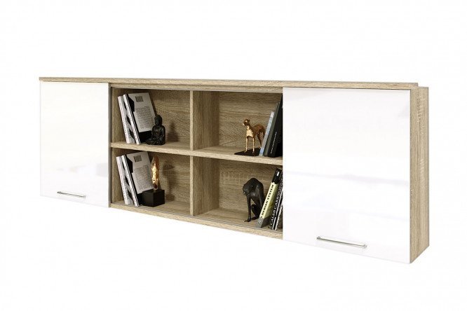 The Stockholm bridge shelf is designed to be placed above a bed from the same series of furniture for teenagers and will not take up extra space in the room. The model is divided by partitions into 8 cells – convenient for systematic storage of books, notebooks, and disks. Sliding fronts in a white glossy decor are mounted on smooth-running guides. The manufacturer emphasizes the need for reinforced fastening of the module: to the wall using the included canopies and hooks, as well as to adjacent cabinets using intersection ties. Warning