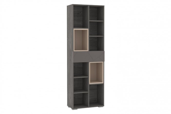 The Summit shelving unit can be installed independently or included as part of a furniture composition in the TV area of the living room. The drawer located in the central part is equipped with a push to open mechanism and visually divides the module into two symmetrical parts. The upper and lower halves are equipped with shelves that form 5 open cells: you can fill them with books, designer dishes, candlesticks, photo frames with family photos. A façade with a geometric pattern and colored decorative inserts refresh the dark finish of the cabinet. The weight of items placed in the box and each of the niches should not exceed 5 kg.
