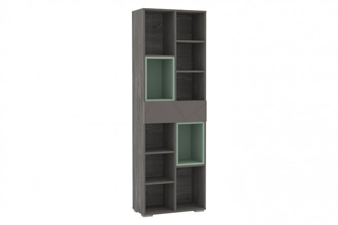 The Summit shelving unit can be installed independently or included as part of a furniture composition in the TV area of the living room. The drawer located in the central part is equipped with a push to open mechanism and visually divides the module into two symmetrical parts. The upper and lower halves are equipped with shelves that form 5 open cells: you can fill them with books, designer dishes, candlesticks, photo frames with family photos. A façade with a geometric pattern and colored decorative inserts refresh the dark finish of the cabinet. The weight of items placed in the box and each of the niches should not exceed 5 kg.