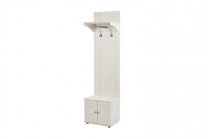 The stylish Sherlock hanger is perfect for decorating a small hallway. The width of this model is only 56 cm, but it can easily accommodate outerwear, bags, umbrellas, hats and other things. The product is made of durable laminated chipboard in a finishing film that imitates the texture and color of natural wood. A cool light gray shade will visually expand the space and make the interior lighter and brighter. The open panel and facades are decorated with MDF profile strips. Below, behind the hinged doors, there is a spacious niche with a shelf for storing shoes.