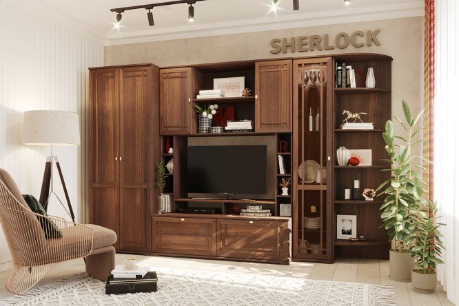 The classic living room is always relevant and pleases the owners and their guests. Noble classic “chocolate walnut” decor, clear geometric shapes, framed facades decorated with MDF layout and binding, tinted glass – all this emphasizes the classic style of the Sherlock living room. Thanks to a large number of modules, you can plan the room exactly according to your wishes and preferences.