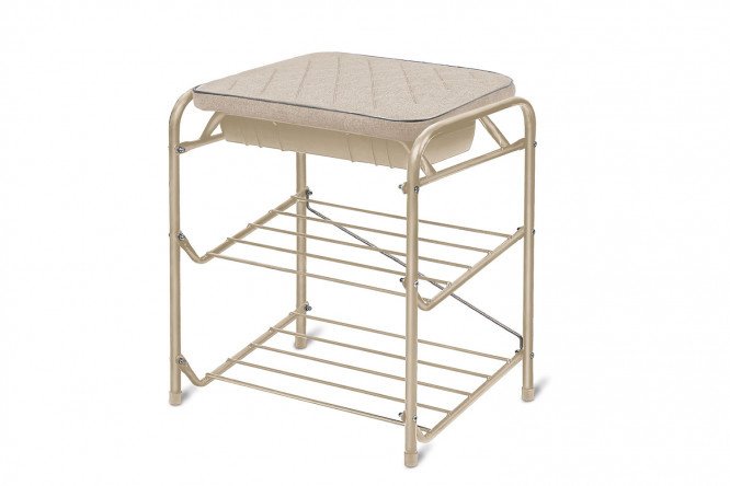 A bench with three shelves, a soft seat and a drawer for storing shoe accessories underneath is a compact solution for neatly storing several pairs of shoes and maintaining order in a small hallway. You can put your purse on the bench or sit down when putting on or taking off shoes. The basis of the shelf is a durable frame made of metal pipe. The shelves are open and made of metal rods, so the shoes are well ventilated and dry quickly after getting wet. The supports are equipped with plastic tips, which prevents the structure from sliding on the floor.