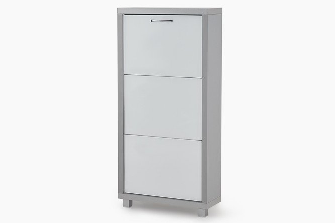 Iron-Lux is a practical and stylish model of a shoe cabinet, equipped with a fan-shaped system for opening shelves. The glass-clad facades and the cabinet shelves can be folded back and pulled out at the same time, using one handle – the fan principle. The folding shelves can easily accommodate the whole family’s shoes, and even with a sharp opening, not a single pair will end up on the floor thanks to the stoppers. The shallow depth makes the shoe rack very compact – it takes up virtually no space and will be a good purchase for a small hallway. The cabinet is equipped with two legs; the back wall is attached to the wall using self-tapping dowels for stability.