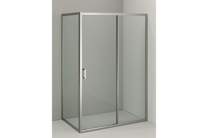 Transparent tempered 6mm glass harmoniously complements the double aluminum profile. The side wall is glass 5 mm thick. Double rollers ensure smooth movement of the sash. Dimensions with adjustable width and depth. Entrance width – 55 cm.