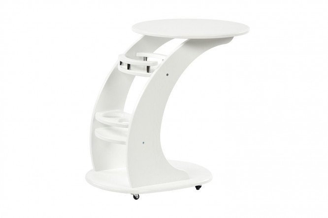 The Athena side table will make a family evening watching TV or in a home theater even more comfortable. A model with wheels can be rolled close to the sofa from the front or placed on the side, above the armrest. There is enough space on the countertop for a small tray with snacks, a remote control, and a tablet. The top shelf is equipped with a double-sided holder that will prevent objects and dishes placed on it from falling; the bottom double shelf has holes for glasses or glasses.