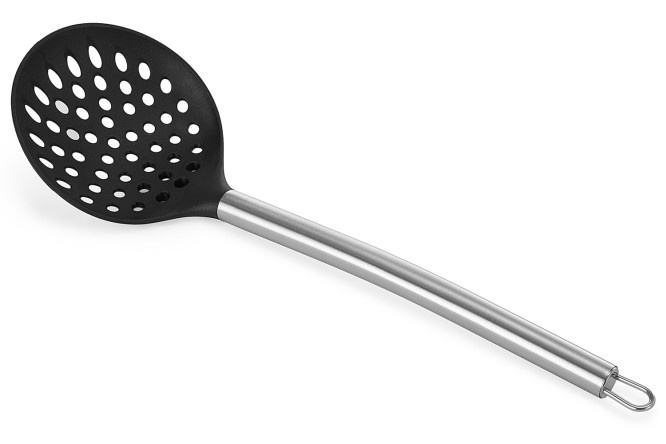 The Levis slotted spoon will not hang idle on the kitchen rail – it will help you remove cooked dumplings, dumplings, pasta from the water, catch fruits and berries from compote, remove french fries and battered fish from boiling oil. Using this tool, it is convenient to remove foam from broth, soup or jam. The working part is made of nylon and will not harm cookware with non-stick coating. The steel handle does not bend even when the scoop with holes is fully loaded; matte polishing gives the accessory a stylish look.