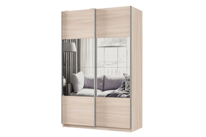Sliding wardrobe 2-door Praktik 140x220x60 cm, light Shimo ash, silver profile, with mirror inserts