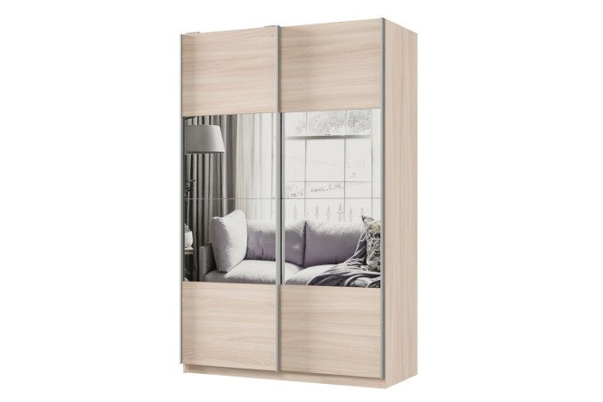 Sliding wardrobe 2-door Praktik 140x240x60 cm, light Shimo ash, silver profile, with mirror inserts
