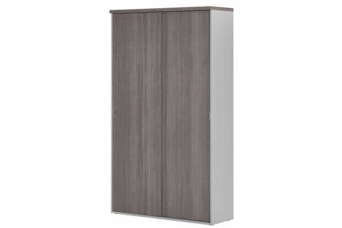 The FLASH sliding wardrobe is a modern interior element that is perfect for ambitious and energetic managers who prefer current trends and creative solutions. It is available in two colors – oak 131 and larch, which harmoniously combine with the gray aluminum frame. This cabinet will be a great addition to your office, providing order and style at the same time.