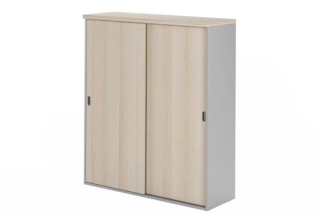 The FLASH sliding wardrobe is a modern interior element that is perfect for ambitious and energetic managers who prefer current trends and creative solutions. It is available in two colors – oak 131 and larch, which harmoniously combine with the gray aluminum frame. This cabinet will be a great addition to your office, providing order and style at the same time.
