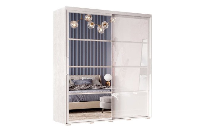 The “Kraft-6” sliding wardrobe with a mirrored door will allow you to competently organize a storage system not only for clothes, but also for household necessities. Inside the cabinet there is one wide compartment with a rod and two narrow shelving compartments with shelves. The cabinet is universal – it can be assembled on both the right and left sides.