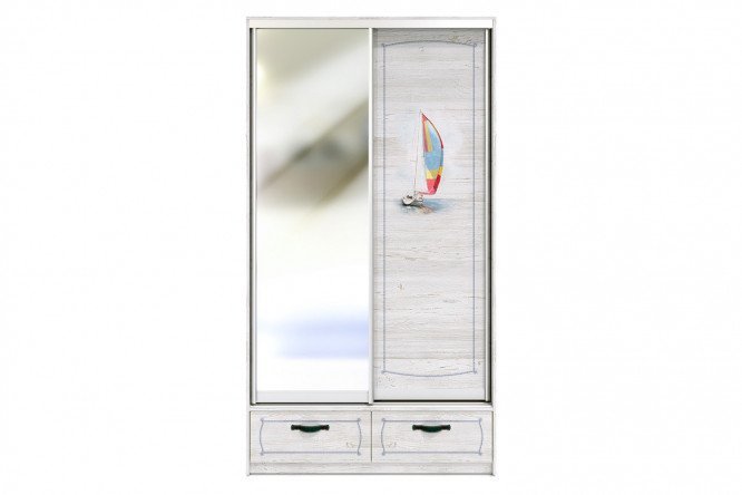 The Regatta wardrobe is designed in a romantic marine theme, exciting the imagination and creating in the room an atmosphere of distant travels and adventures. This model will faithfully serve its owner for many years: the bright designs applied using ultraviolet printing are highly resistant to abrasion. The ends of the cabinet are protected with impact-resistant ABS edges. Support on the bottom guide prevents sliding facades from sagging over time. Special brushes on the doors prevent dust from getting inside the cabinet, so things will always remain clean. The compartment doors are framed with a C-shaped aluminum profile. The interior contents include reliable shelves and a metal rod for hanging clothes on hangers. There are spacious drawers at the bottom.