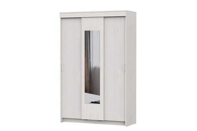 The ShKP 2 sliding wardrobe is quite spacious and at the same time allows you to take advantage of the main advantage of furniture of this type: sliding doors do not require additional space to swing open. The internal content of the module is standard: a large wardrobe compartment is equipped with a longitudinal rod, and three shelves are located in the narrower linen section. The model is equipped with a hanging system: an upper metal guide is used to fasten the doors. A mirror overlay measuring 130×30 cm is glued to the central door. For ease of opening, handles are provided on the side facades.