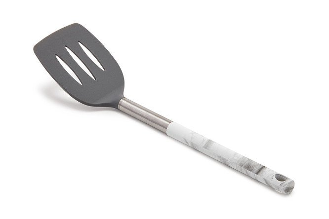 The durable and convenient BERKRAFT Marble spatula is indispensable in the kitchen. The spatula is made of heat-resistant materials, is not afraid of high temperatures and can be used with cookware that has a non-stick coating. The working part of the accessory is equipped with oblong slits, thanks to which, during frying, oil and fat will remain in the pan and will not end up on the plate along with the pancakes or cutlets. The long, comfortable handle is equipped with a large storage loop on the rail. The accessory has a stylish, laconic design, will fit organically into the space of any modern kitchen and will last for many years.