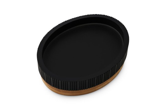 The soap dish is made in the form of an oval bowl with high sides, decorated with a jagged pattern. The bowl is mounted on a bamboo stand, which looks impressive in combination with the black body. In addition, such a stand will prevent the soap dish from falling even from the side of the sink that is slippery from water.