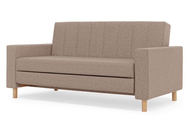 The Miller sofa, designed in a Scandinavian style, will help create a cozy place to relax in a modern living room. Thanks to the universal Eurobook transformation mechanism, the sofa quickly and conveniently folds out into a spacious sleeping area. A durable plywood frame, reliable fastening fittings and durable matting upholstery guarantee durability. Tall wooden legs make cleaning with a mop or vacuum cleaner easier; a robot vacuum cleaner can easily pass under the sofa.