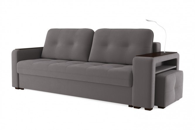 Sofa SMART – modern comfort in every detail. The pantograph transformation mechanism allows you to easily and conveniently unfold the sofa into a comfortable sleeping place. Wide armrests with pads can be used as a shelf or table. Included with the sofa is a wide ottoman that can be tucked away compactly under the armrest.