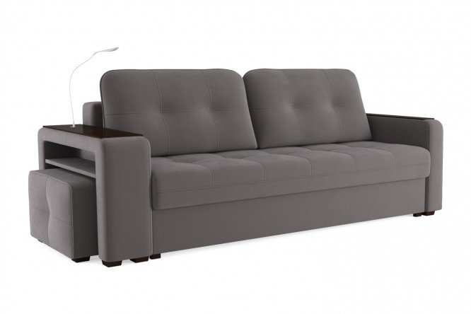 Sofa SMART – modern comfort in every detail. The pantograph transformation mechanism allows you to easily and conveniently unfold the sofa into a comfortable sleeping place. Wide armrests with pads can be used as a shelf or table. Included with the sofa is a wide ottoman that can be tucked away compactly under the armrest.