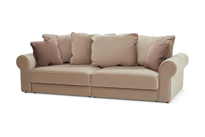 The spacious Florence sofa bed with low legs will fit well into the decor of a living room, nursery, office in the Art Nouveau, Provence or classic style. The model with comfortable bolstered armrests is made of plain velor, pleasant to the touch. Four back pillows and two decorative pillows will help you find the most comfortable resting position.