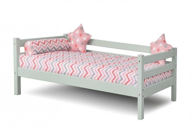 Children’s bed with back protection Sonya made of solid pine material in green color.