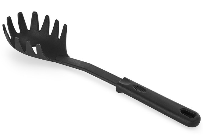 Every spaghetti spoon will definitely appeal to connoisseurs of classic Italian cuisine. With its help, it is convenient to separate the pasta from each other during cooking, remove them from the pan and place them on plates. Tall, curved teeth will securely hold the spaghetti inside the spoon, preventing it from falling out. A special round hole will not only drain the liquid, but will also be useful for correctly calculating the amount of product before cooking: how much dry pasta will fit in it is the amount needed for one average portion. The product, made of high-quality food-grade thermoplastic, will not scratch the non-stick coating. The long ergonomic handle does not heat up.