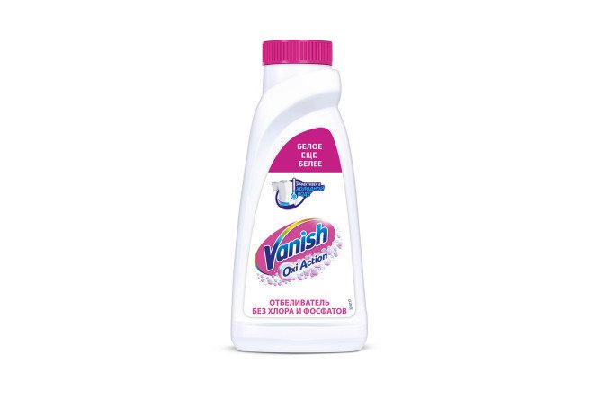 Stain remover Crystal White is an effective product from the arsenal of household household chemicals, designed specifically for white fabrics. Liquid Vanish Oxi Action will remove coffee stains from a light furniture cover, grass marks from white jeans, and ballpoint pen marks from a school blouse. Since there is no chlorine in the composition, bleach is safe for fabrics with delicate textures – silk, natural wool. The effectiveness of the product does not decrease, even if you add it to cold water during washing. The bottle cap acts as a measuring container.