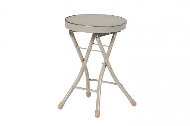 The TBSC stool is a practical solution for a small kitchen or summer veranda. The compact folding model is easy to transport to the country house, move for drinking tea in the fresh air or for daily cleaning. Despite its external lightness, the product has a sufficient margin of strength and can withstand weight up to 100 kg. The frame is made of metal pipe, the supports are equipped with plastic protective caps. The round wood board seat is covered in vinyl leather that is resistant to moisture and stains.