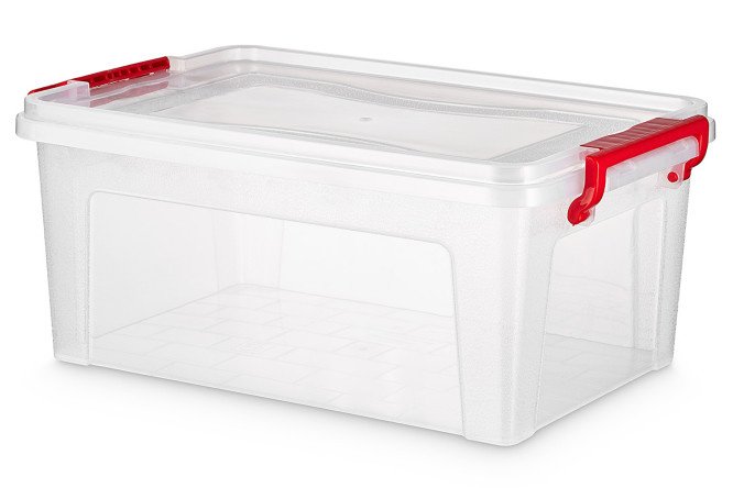 A transparent plastic container with a lid is a convenient container for storing household items.